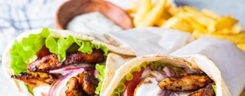 Alle Gerichte werden mit Pita, Tomaten, Zwiebeln, Beilage nach Wahl und Tzatziki serviert.